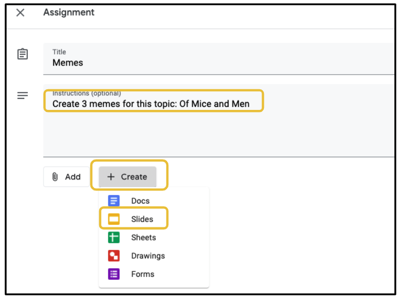 Get started by creating a Memes Template assignment in Google Classroom. The template allows you to reuse the post over and over without having to reinvent the wheel. Add simple instructions that can be altered if needed each time you reuse the assignment. Click Create and choose Slides. When you reuse it in the future, a new copy of this Slides template will be made each time. With each reuse, if you need to augment it, you can, but the basic structure will always be the same.